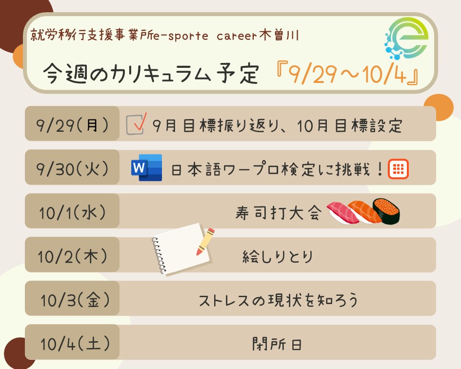 今週のカリキュラム予定≪9/29~10/4≫