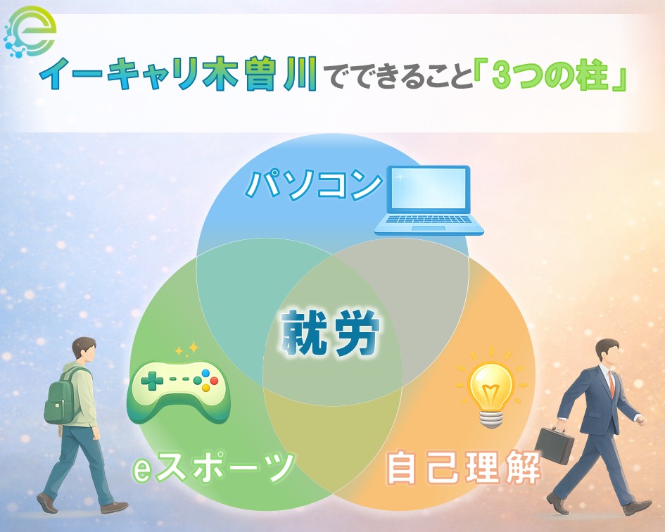 イーキャリ木曽川では、主に「パソコン」・「eスポーツ」・「自己理解」の3つに取り組むことができます。